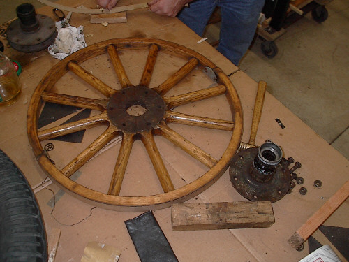 the rivets were removed. It seems that the rivets pull the metal into the wood and it drags everywhere that a rivet had been. That wood never would have just fallen out as I had feared. Anyway, once the wood was out, the wood was soaked for 24 hours and the felloes were once again driven back into place and the rivets popped into place. The pictures show the wheels as the hubs are removed and the wood is read to be placed back into the rim. | |||||||||||||||||||||||||||||||||||||||||||||||||||||||||||||