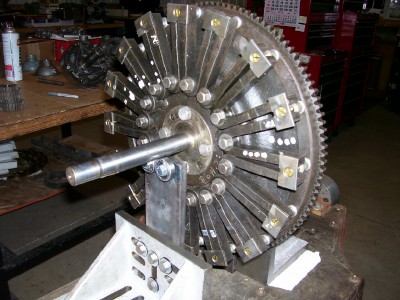 picture above, you can see that bearings have been used to provide the cradle for the spinning mass to set in. We were able to watch the flywheel rotate and note where it stopped. The white dots denote the heavy spot of the flywheel. This is where we drilled a hole to lighten up that side of the flywheel. The picture does not show the shop vacuum that we used to pick up the chips as the drill was applied to the edge. Otherwise the magnets would have been hairy with metal shavings. | |||||||||||||||||||||