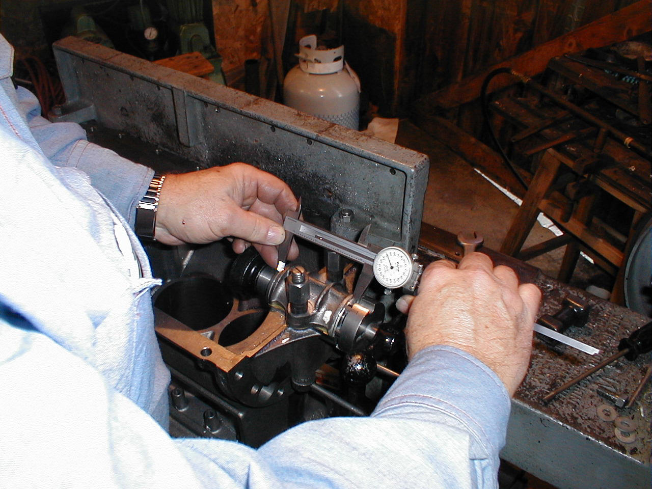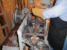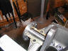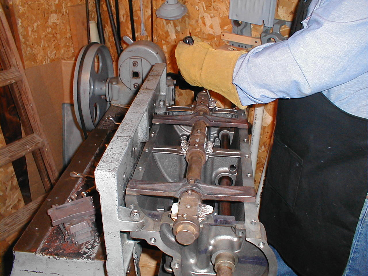 | Once all of the main bearings are set, the table of the Wilson Line Bore machine is flipped up and the crank is run in. The machine runs slow enough that there is not much chance of overheating a bearing |