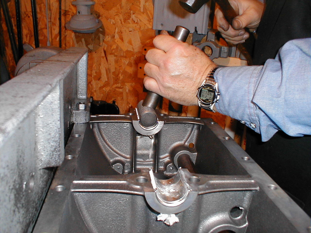 | As the babbit cools, it has a tendency to pull away from the iron in the block. The babbit is set in the block with a special tool made just for this purpose. The tool is wrapped with a hammer, first straight down and then to both sides. |