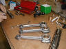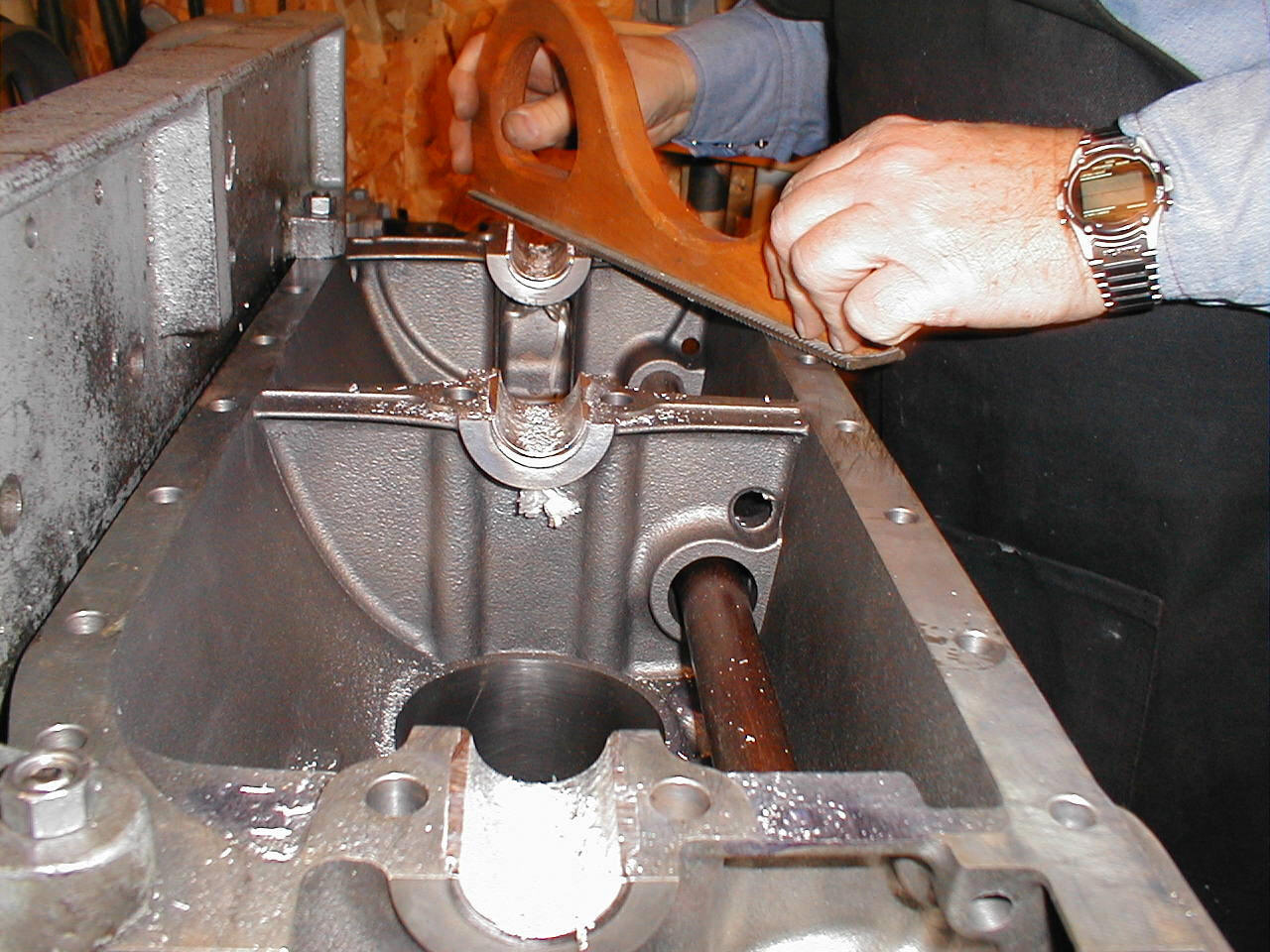 | A coarse rasp is used to rough cut the edges of the bearing smooth with the bottom face of the pads. Notice the rod that is running in the cam guides. It is used as a locater of all of the setup of the bearings and cam shaft |