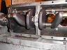| The pouring process begins with the setup of the pouring fixture centered over the three block mains. Chills are placed next to the fixture to help guide the babbit into place and create a shear spot to clean off the extra babbit. |